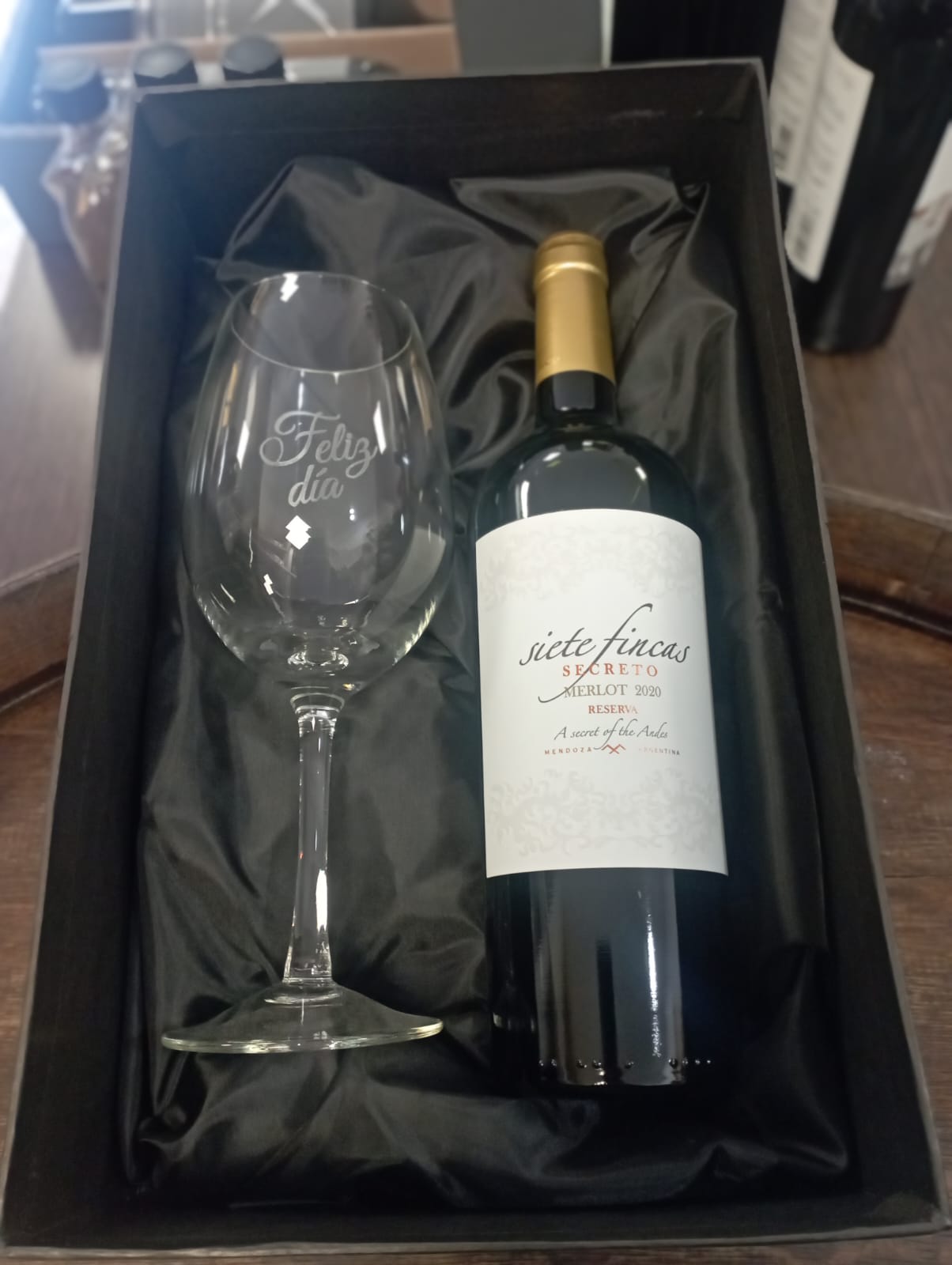 1 copa Bordeaux grande con inscripción «Feliz día».