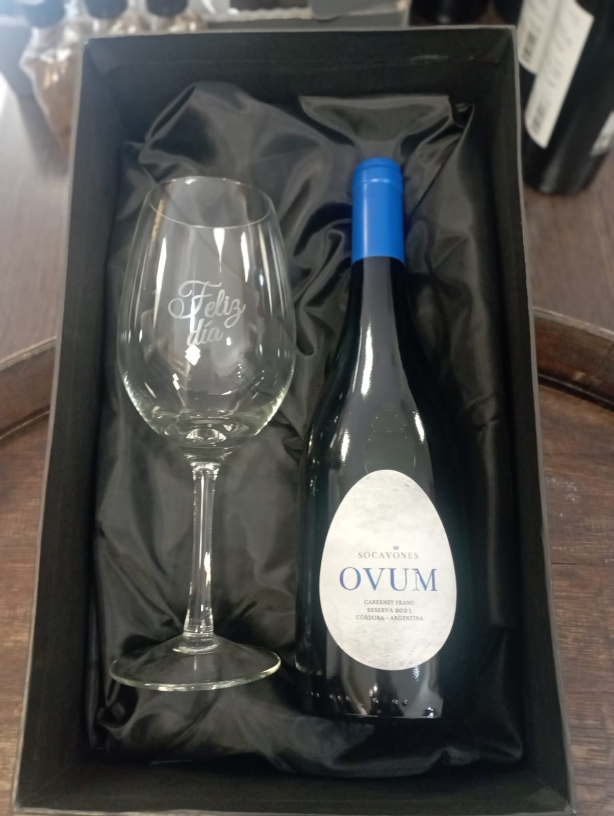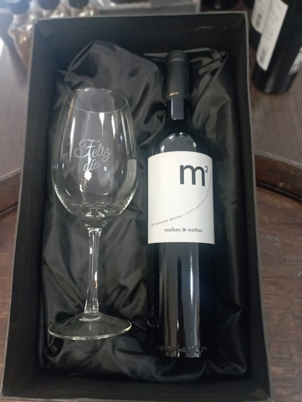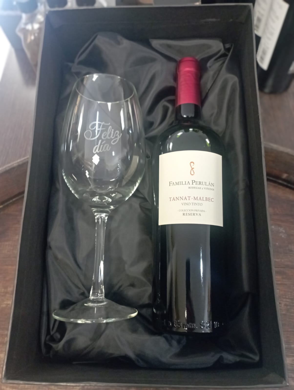 1 copa Bordeaux grande con inscripción «Feliz día».